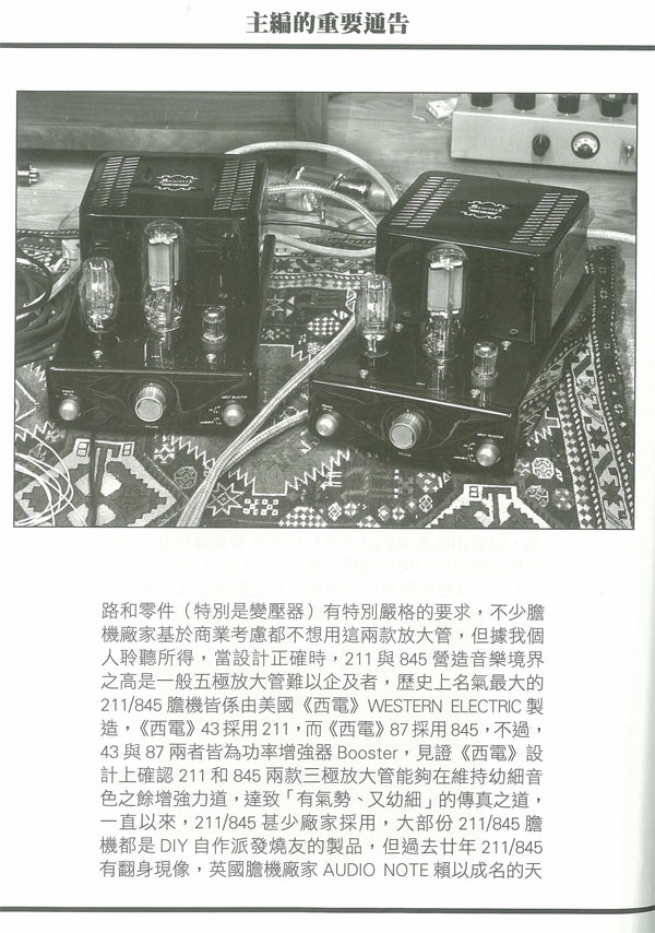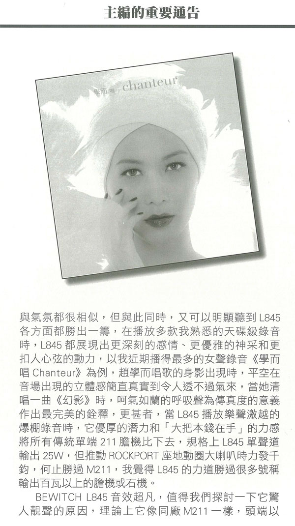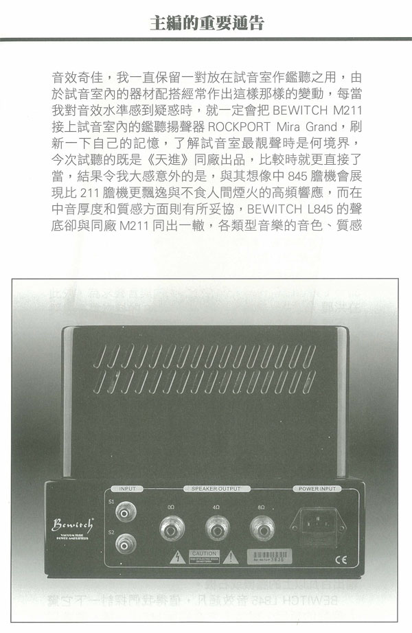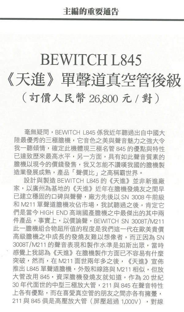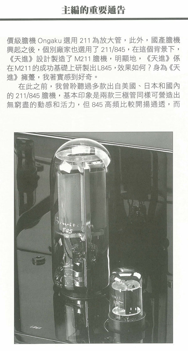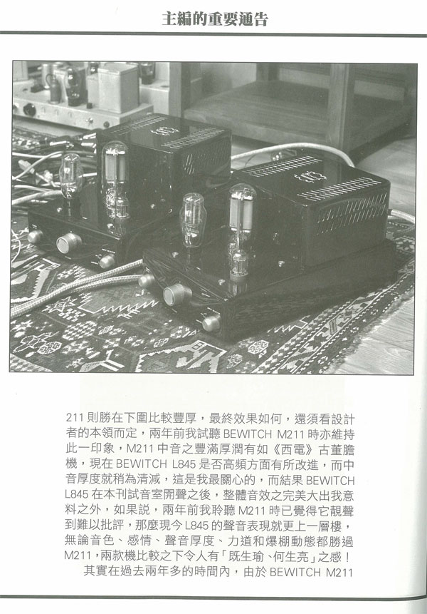 在此之前,我曾聆聽過多款出自美國、日本和國內的211/845膽機,基本印象是兩款三極管同樣可營造出無窮盡的動感和活力,但845高頻比較開揚通透,而211則勝在下圍比較豐厚,最終效果如何,還須看設計者的本領而定,兩年前我試聽BEWITCH M211時亦體質此一印象,M211中音之豐滿厚潤有如《西電》古董膽機,現(xiàn)在BEWITCH L845是否高頻方面有所改進,而中音厚度就稍為清減,這是我最關心的,而結果BEWITCH L845在本刊試音室開聲之后,整體音效完善大出我意料之外,如果說,兩年前我聆聽M211時已覺得它靚聲到難以批評,那么現(xiàn)今L845的聲音表現(xiàn)就更上一層樓,無論音色、感情、聲音厚度、力道和爆棚動態(tài)都勝過M211,兩款機比較之下令人有《既生瑜、何生亮》之感!