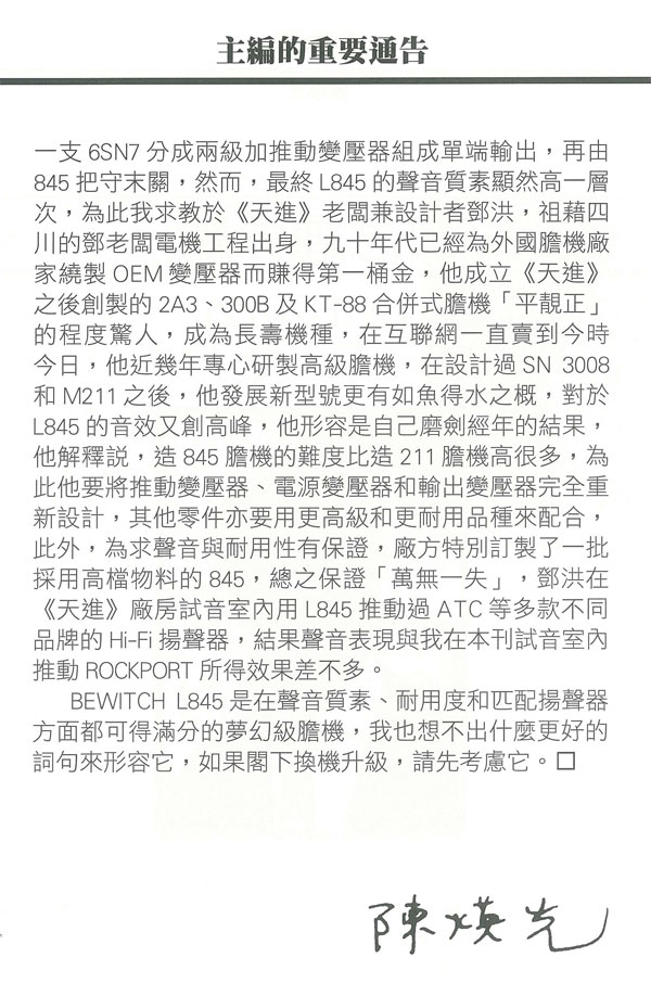 BEWITCH L845是在聲音質素、耐用度和匹配揚聲器方面都可得滿分的夢幻級膽機,我也想不出什么更好的詞句來形容它,如果閣下?lián)Q機升級,請先考慮它。