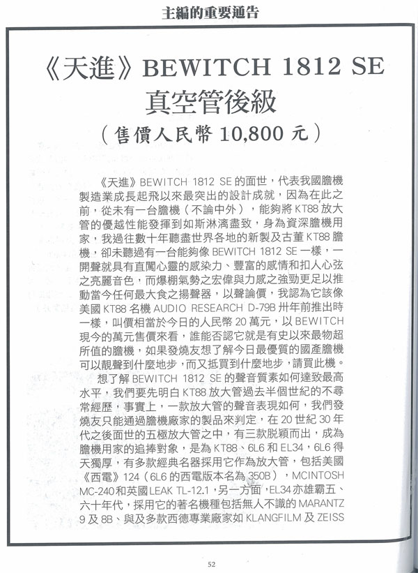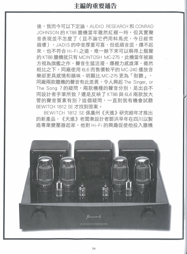 《天進(jìn)》Bewitch 1812 SE的面世,代表我國膽機(jī)制造業(yè)成長起飛以來最突出的設(shè)計(jì)成就,因?yàn)樵诖酥埃瑥奈从幸慌_膽機(jī)(不論中外),能夠?qū)T88放大管的優(yōu)越性能發(fā)揮到如斯淋漓盡致,身為資深膽機(jī)用家,我過往數(shù)十年聽聽世界各地的新制及古董KT88膽機(jī),卻未聽過有一臺能夠像Bewitch 1812 SE一樣,一開聲就具有直闖心靈的感染力、豐富的感情和扣人心弦之亮麗音色,而爆棚氣勢之宏偉與力感之強(qiáng)勁更足以推動當(dāng)今任何最大食之揚(yáng)聲器,以聲論價(jià),我認(rèn)為它該像美國KT88名機(jī)AUDIO RESEARCH D-79B三年前推出時一樣,叫價(jià)相當(dāng)于今日的人民幣20萬元,以Bewitch 現(xiàn)今的萬元售價(jià)來看,誰能否認(rèn)它就是有史以來最物超所值的膽機(jī),如果發(fā)燒友想了解今日最優(yōu)質(zhì)的國產(chǎn)膽機(jī)可以靚聲到什么地步,而又抵買到什么地步,請買此機(jī)。