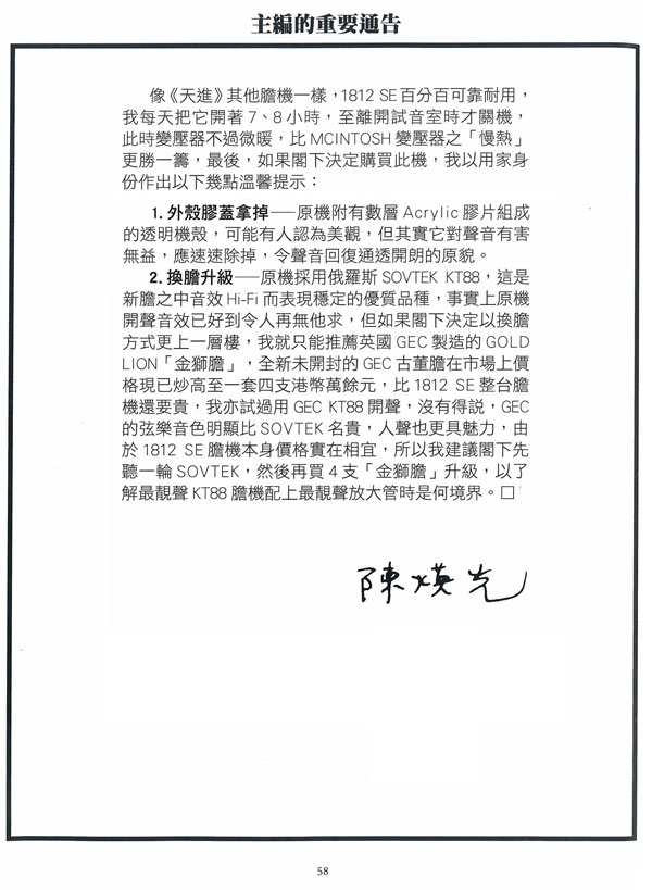 摘自2015年2月發(fā)燒音響陳英光《主編重要通告:有史以來最靚聲的KT88膽機(jī)》