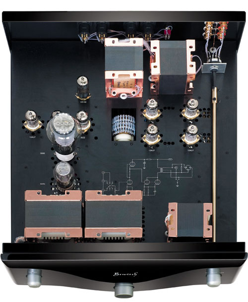 該前級(jí)的放大基本電路是:第一級(jí)12AU7 SRPP放大,第二級(jí)12AU7并聯(lián)與變壓器組成單端輸出,兩級(jí)之間直接偶合。